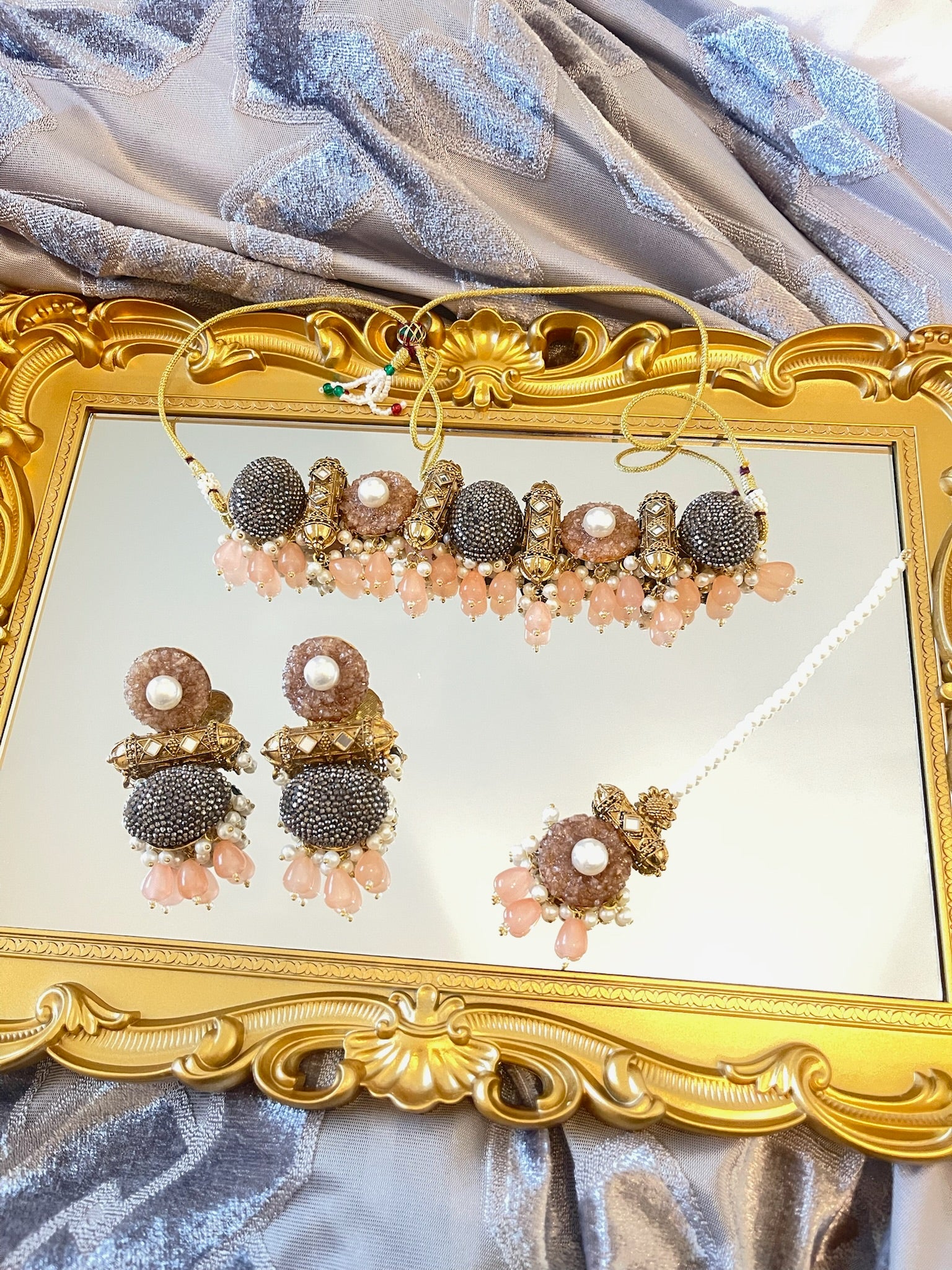 Material: Premium-quality alloy with an antique gold finish, pearls, and crystal embellishments.
