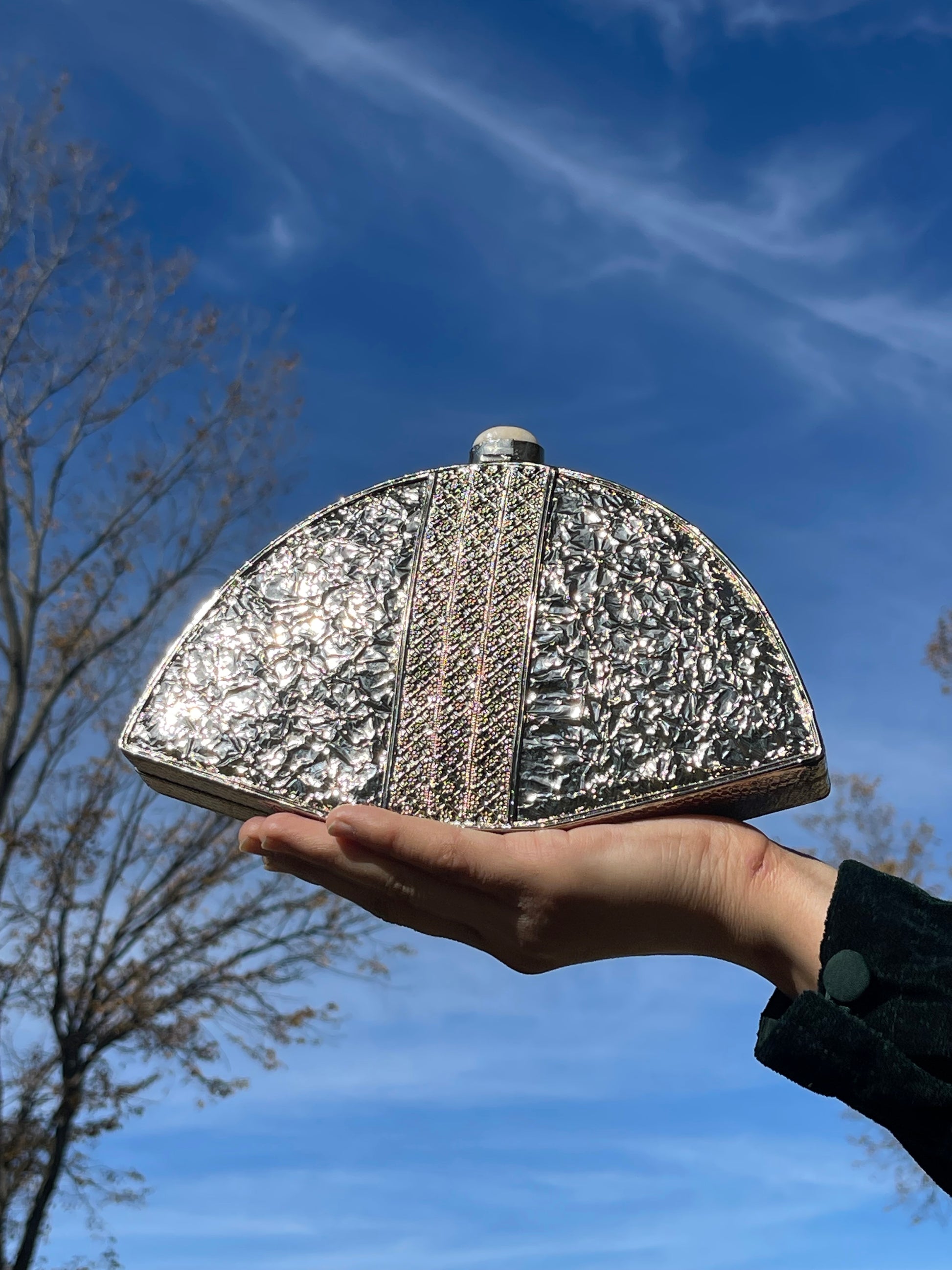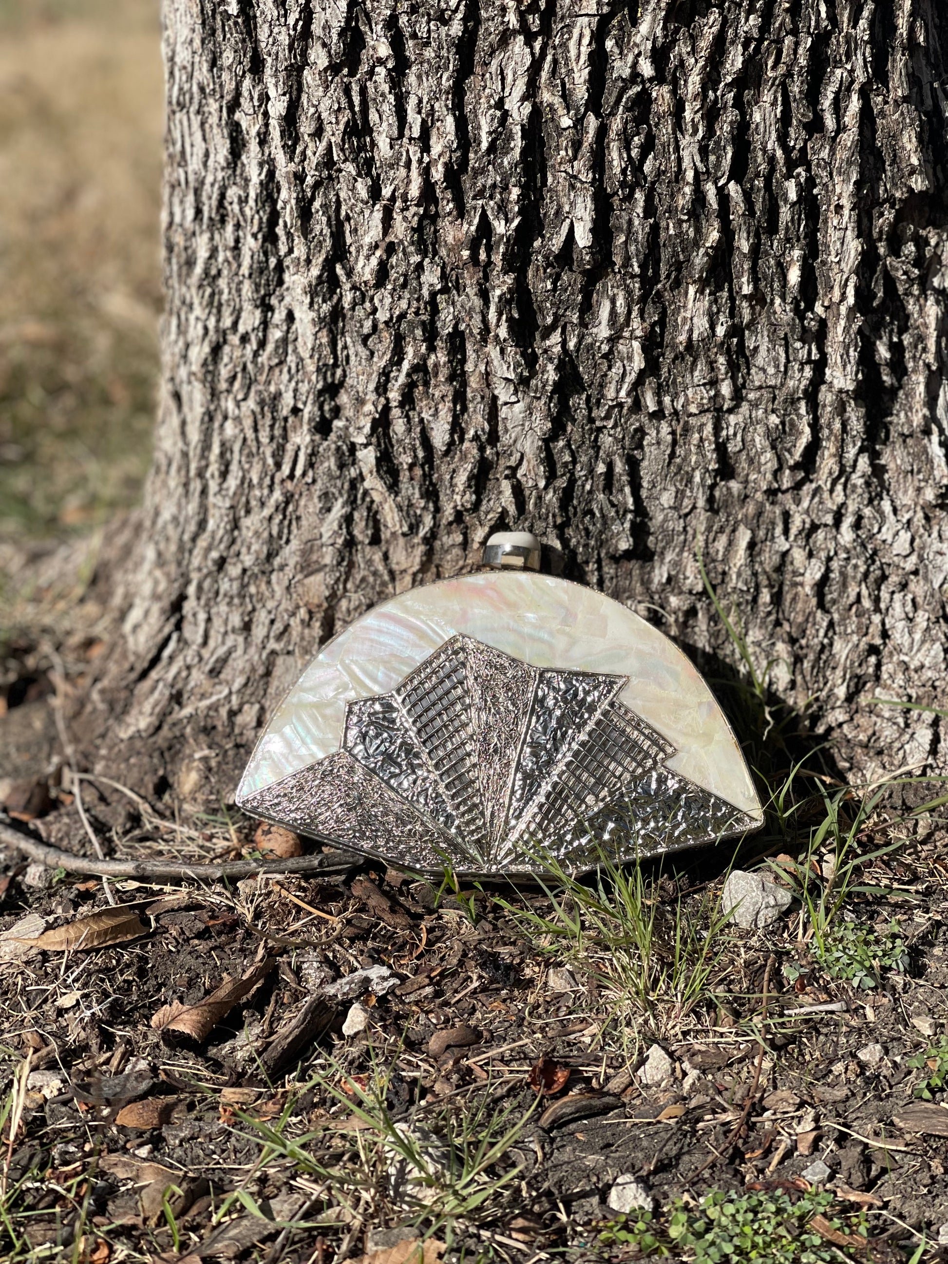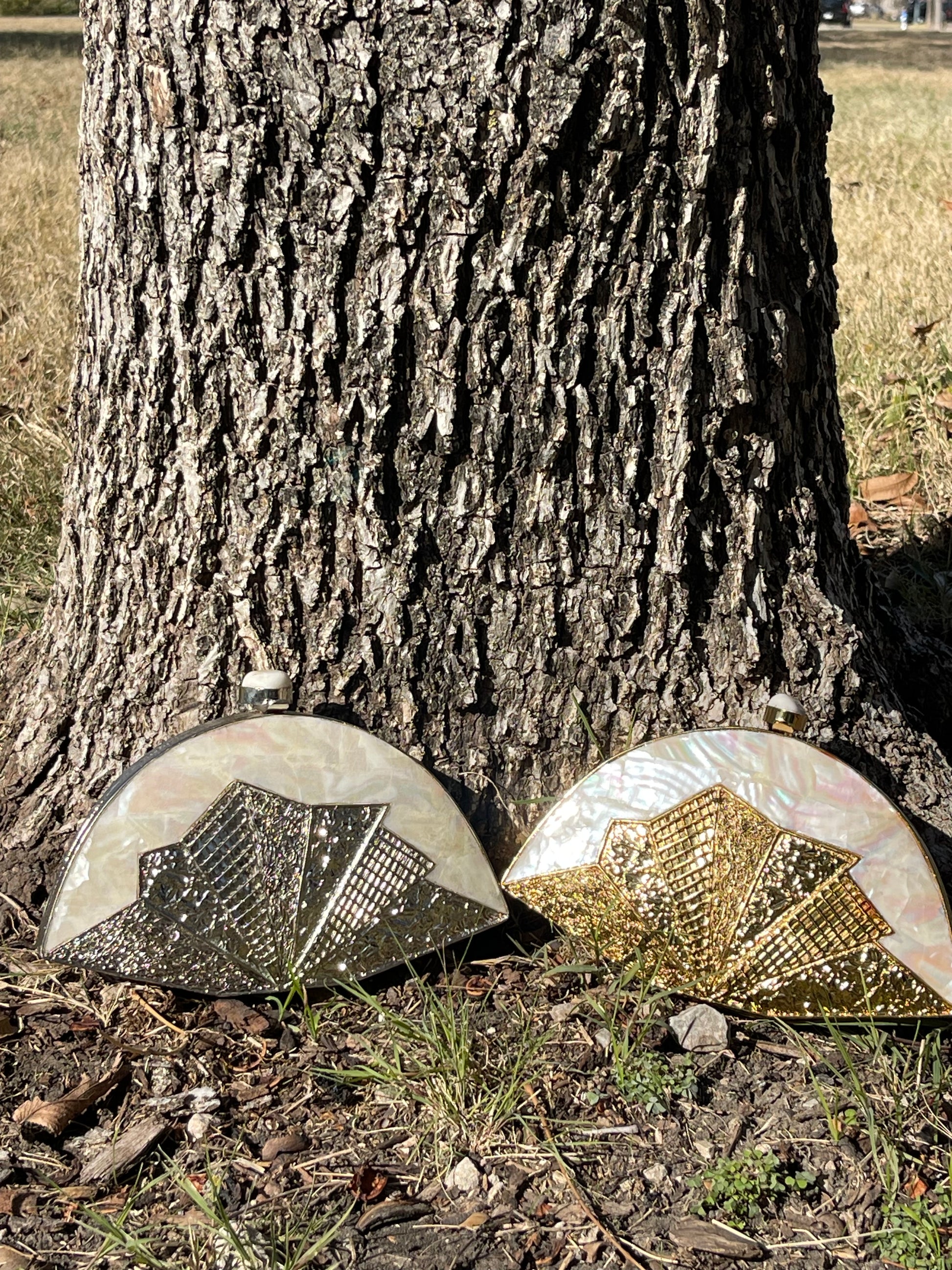 Inspired by old-world glamour, the Sheesha Fan Clutch is a showstopper in every sense. With its fan-shaped silhouette, textured silver or gold detailing, and pearly sheen, it brings drama in the most refined way.